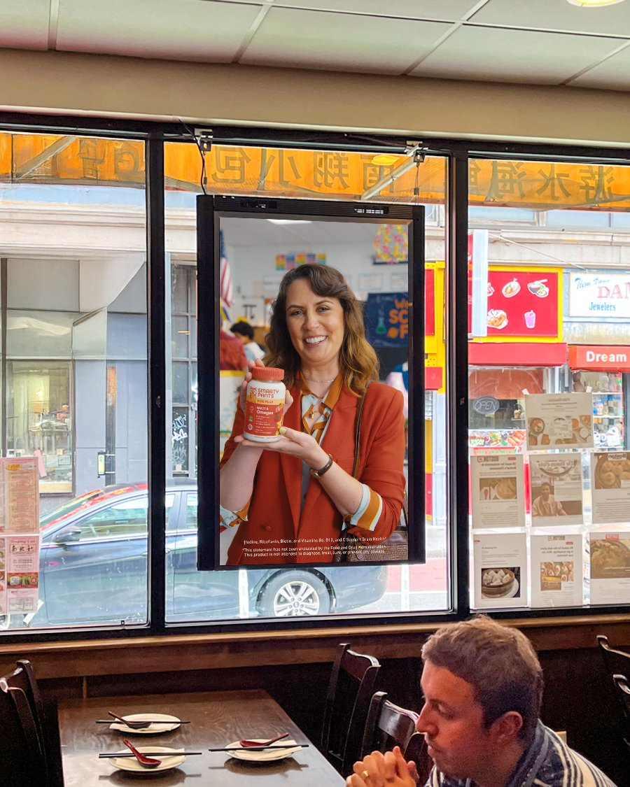 Dual-sided placement: street-facing reach + in-store buying-mindset audience